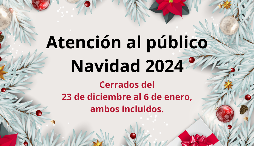 ATENCIÓN AL PÚBLICO NAVIDAD 2024 Cerrados del 23 de diciembre al 6 de enero, ambos incluidos. ¡Felices Fiestas!
